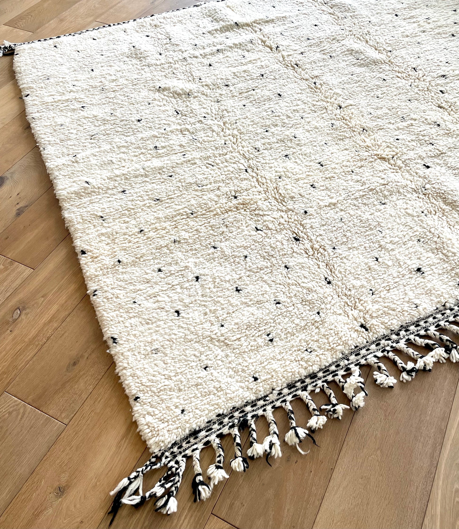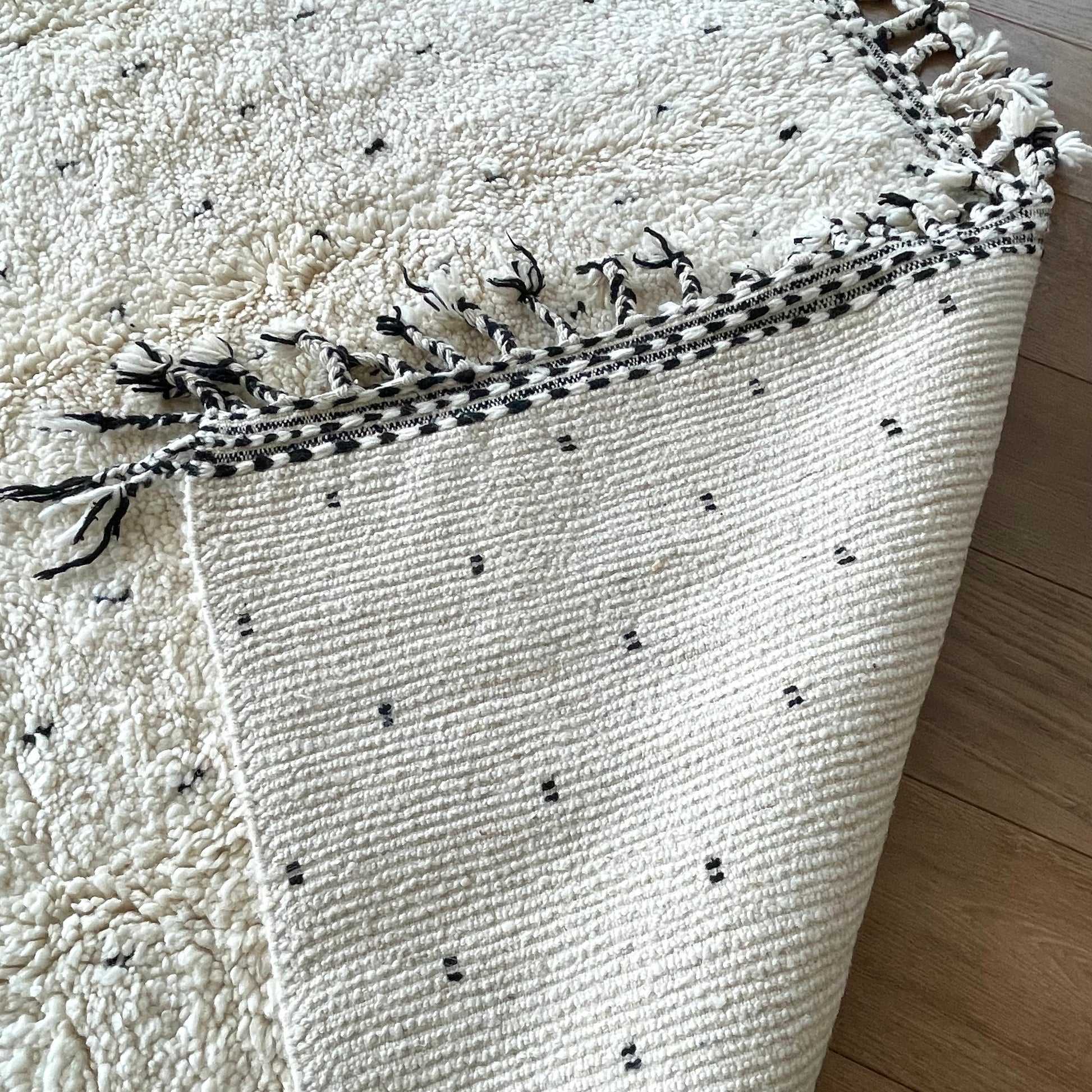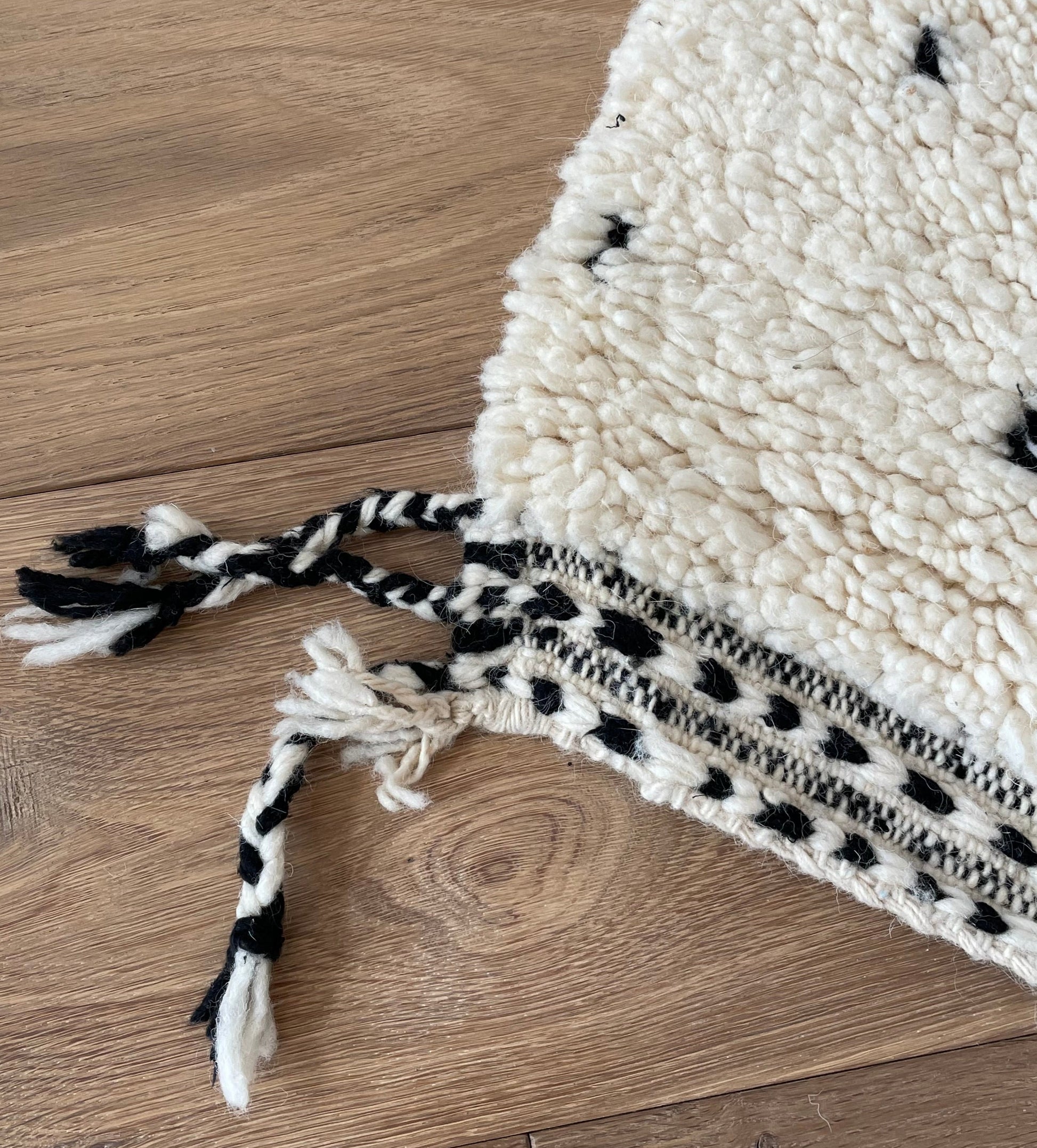 What is unique about this beauty is that it is finished with thick, braided, black and white tassels on both ends. Woven by Berber women in the Atlas Mountains of Morocco, Beni Ouarain rugs are among the most popular and recognizable for their creamy white wool and typical black and white designs.