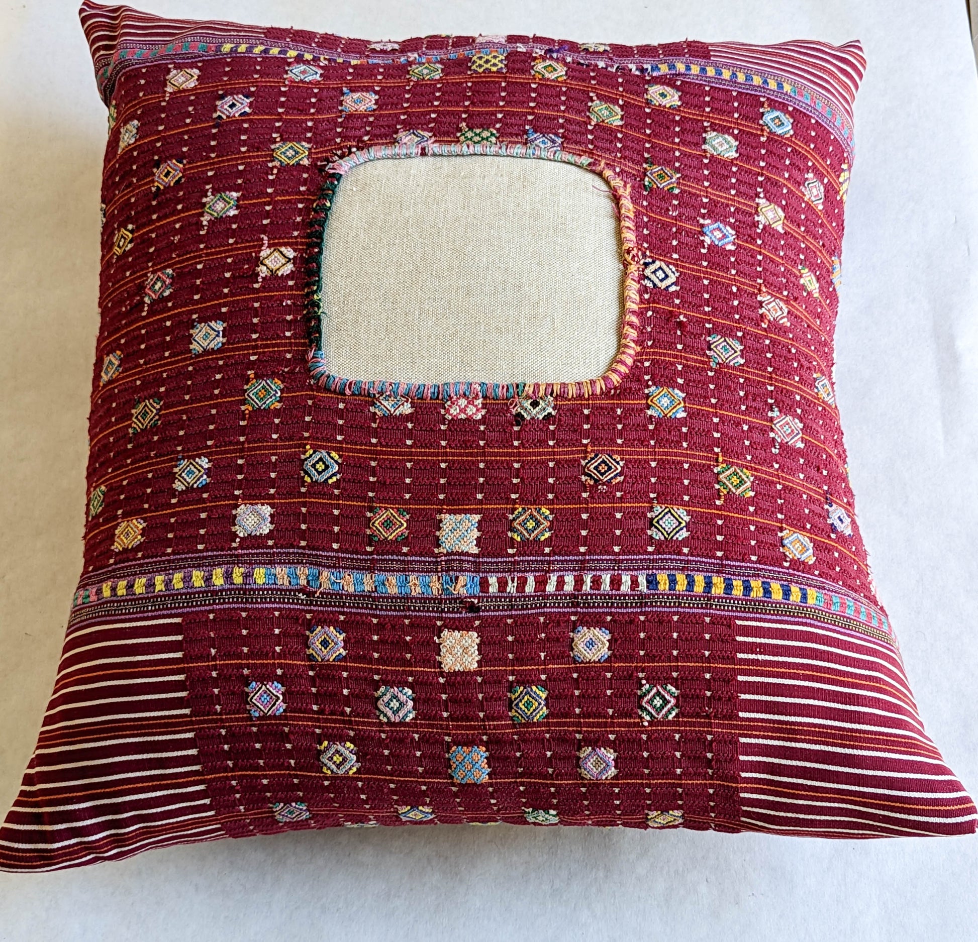 This one-of-a-kind pillow was created from vintage, handwoven Guatemalan blouse fabric incorporating traditional indigenous symbols and vibrant colors.