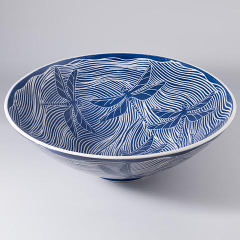 One of a series of breathtaking, hand thrown large blue and white porcelain bowls with sgraffito carved images of dragonflies.