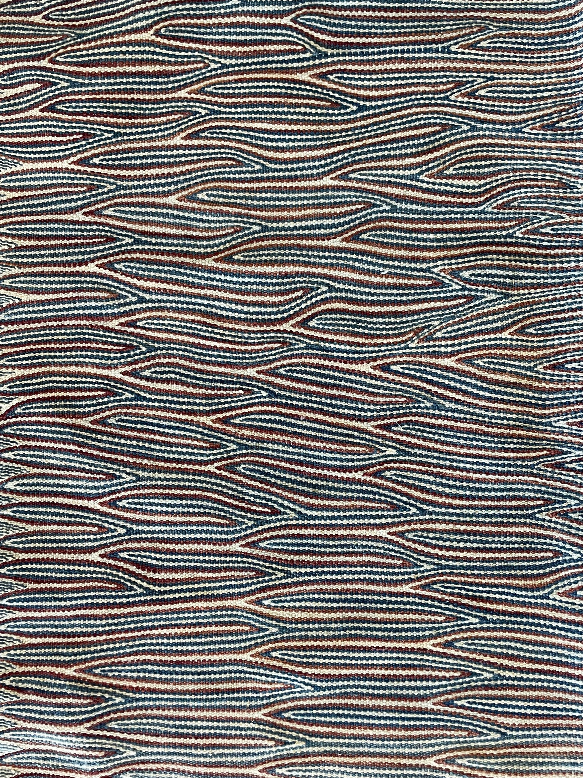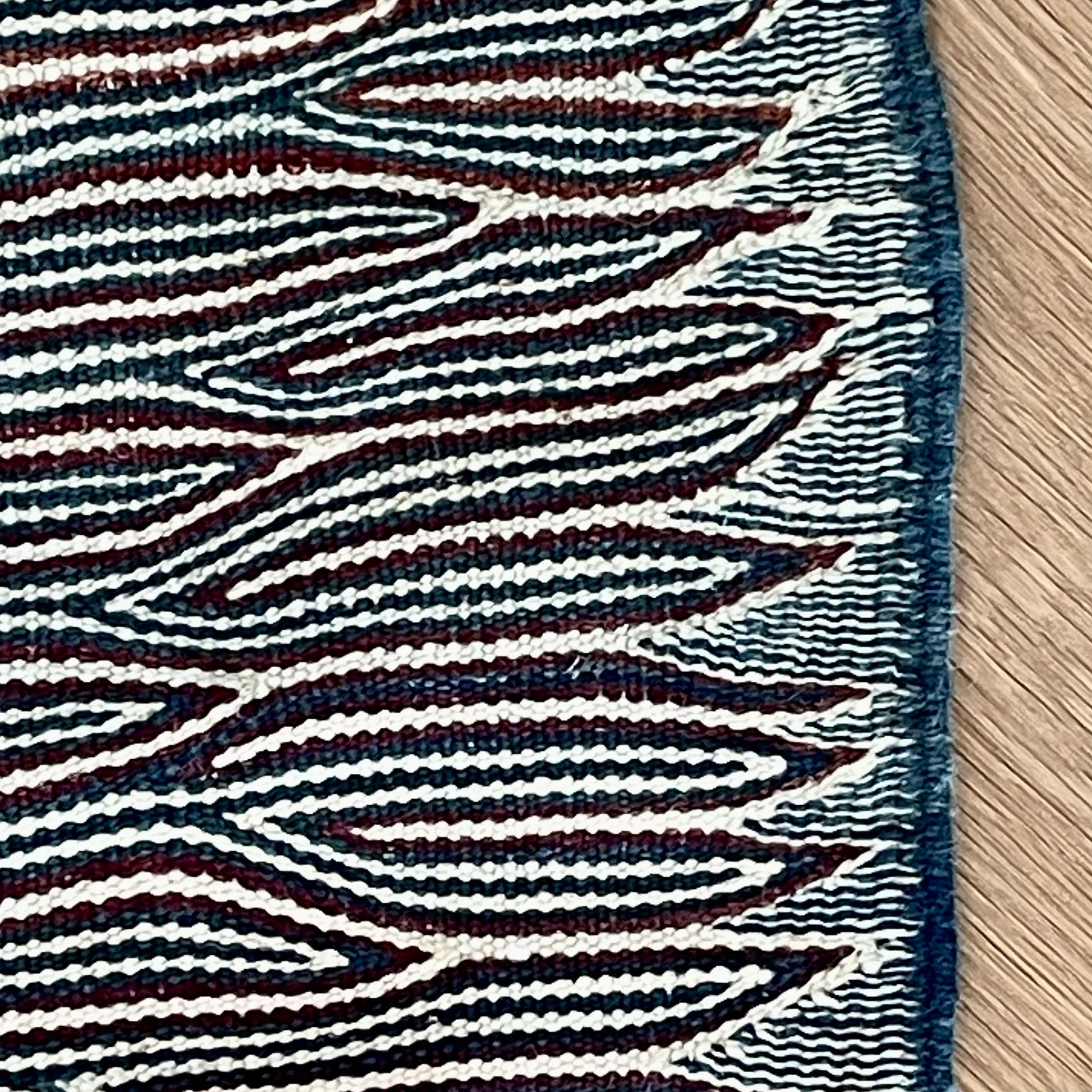 Moroccan women weavers in the Taznakht region south of Marrakesh are renowned for their mesmerizing 'wave' motifs in harmonious palettes. The name 'Kaia' in Arabic means ocean or sea. This beautiful reversible kilim is woven in rich but muted tones of deep blue, cream and brown. Both ends are finished w/ two solid border stripes in complementary shades of orange and blue with short, knotted tassels on one end.