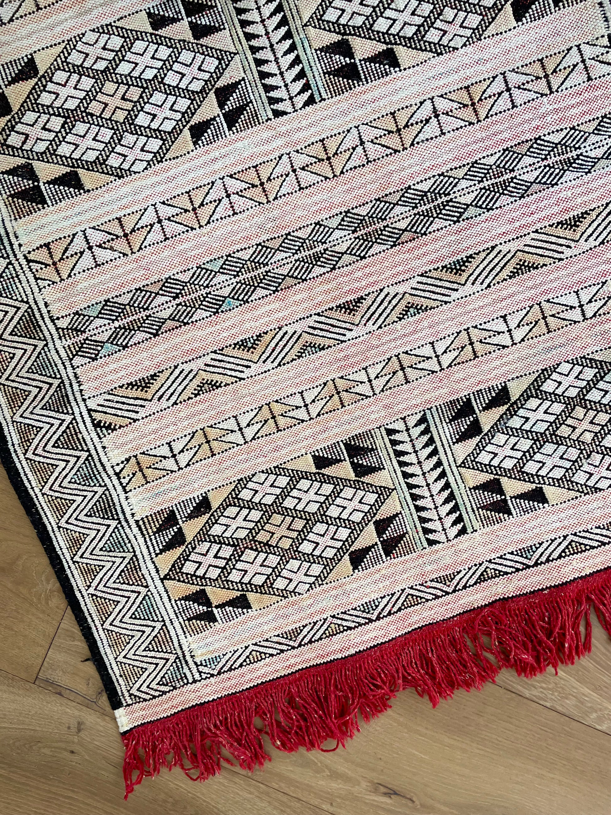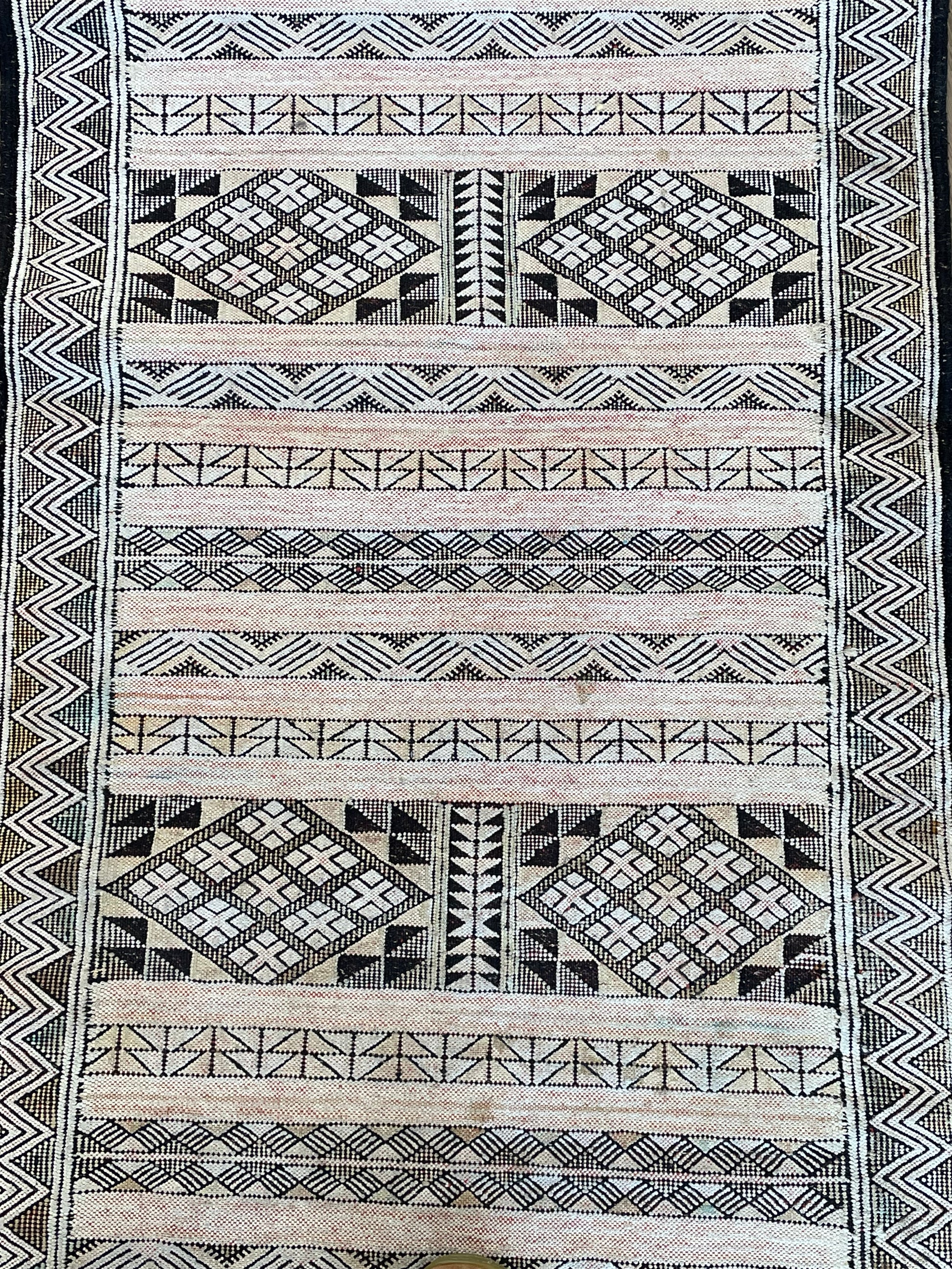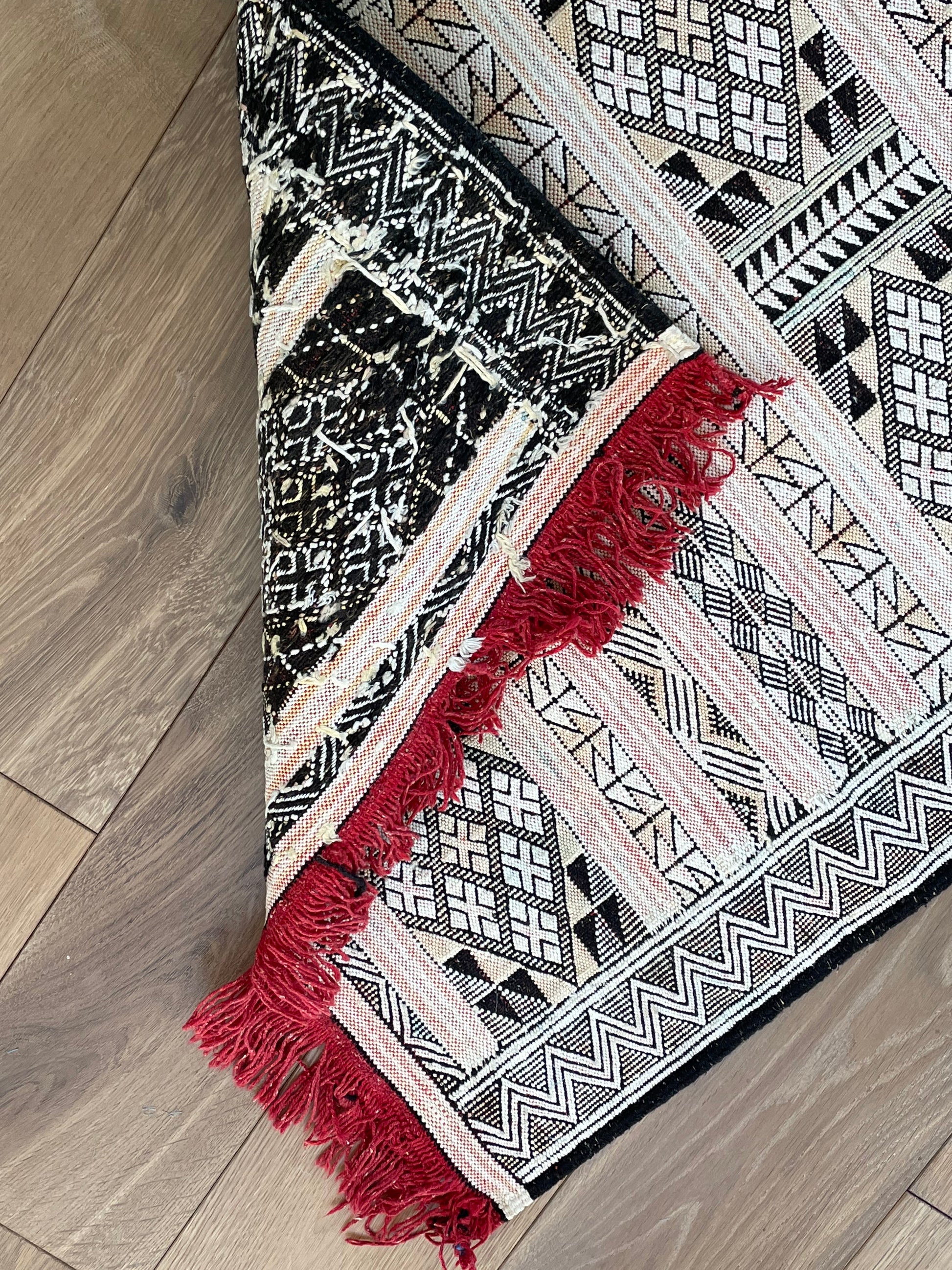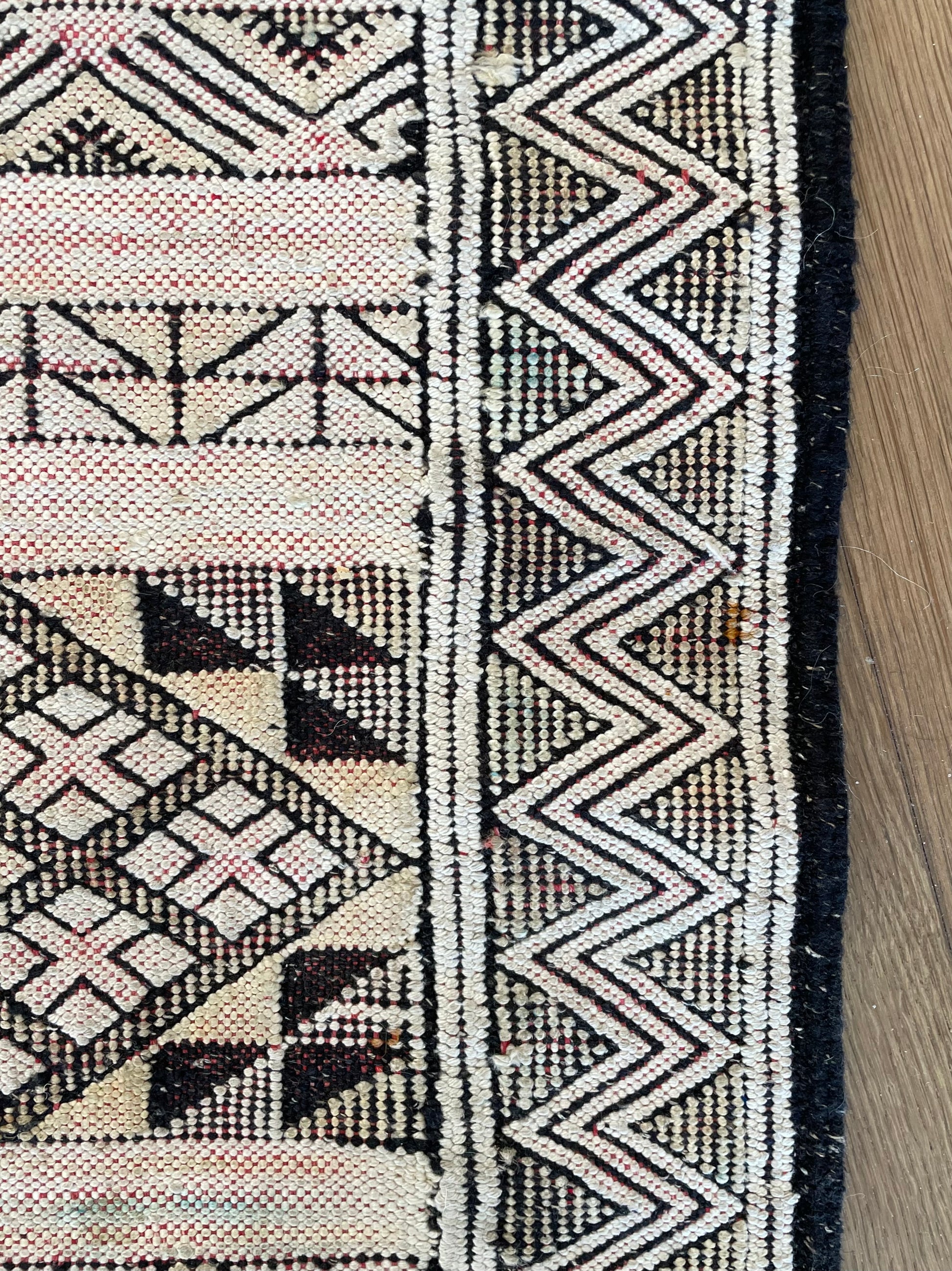 "Salam", meaning peace in Arabic, perfectly describes the muted, neutral colors of this vintage Ait Zaiane runner. Finely woven with wool and red cotton warp thread, the detail and variety of the Berber symbols is impressive. Perfect as a hall or entry runner. The Zaiane Confederation is located near the Atlantic coast, north of Rabat.
