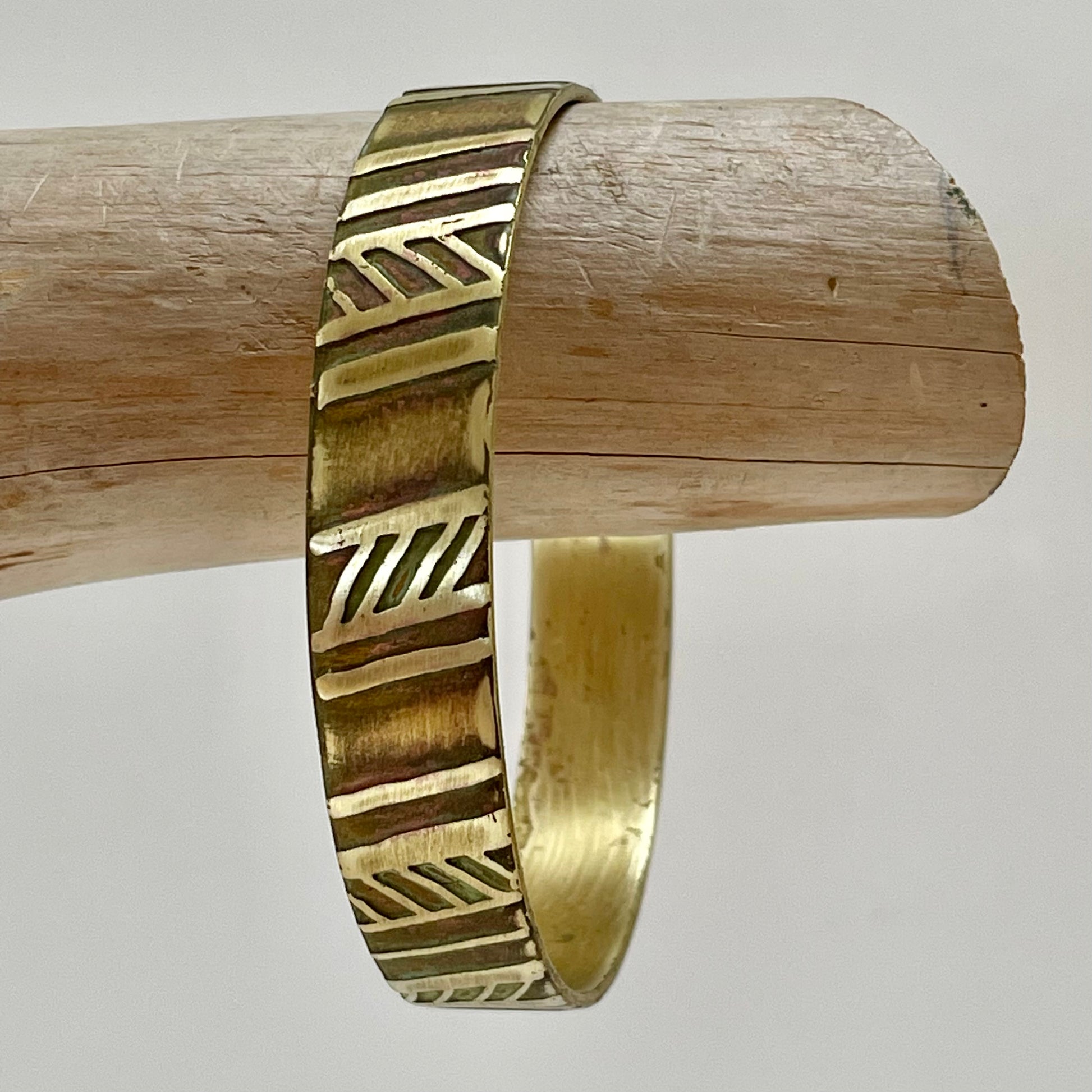Hand etched, this bangle will develop a beautiful patina as it ages. And...it will not discolor your skin. Minor 'imperfections' in the design are a result of the etching process.