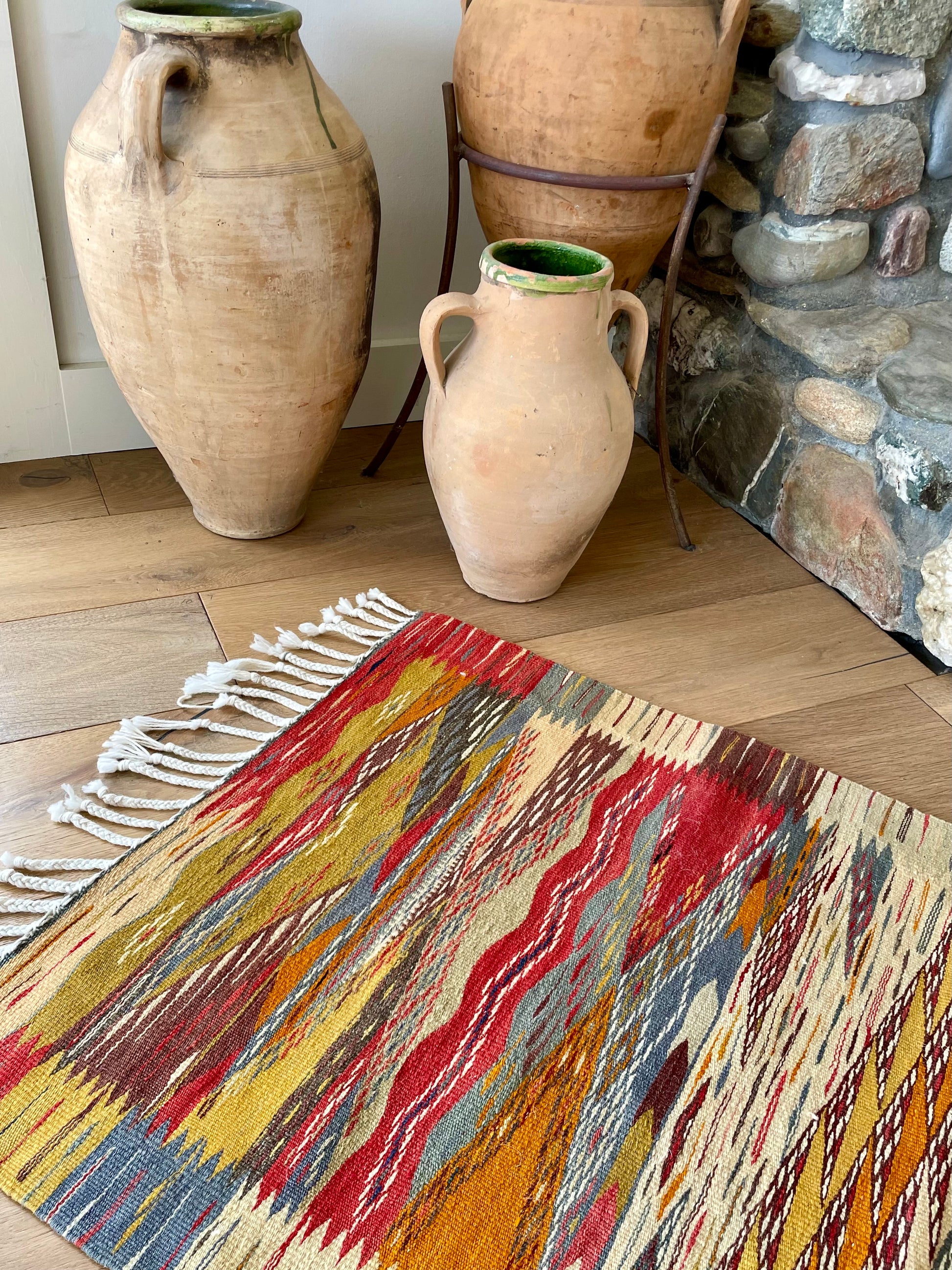 Small and vibrant, this new Taznakht tapestry style area rug has a beautiful multicolored palette of soft red, burnt orange, olive green and streaks of pale blue that somehow manage to work together. The color choices of the Taznakht weavers are always unique and magical. Reversible.